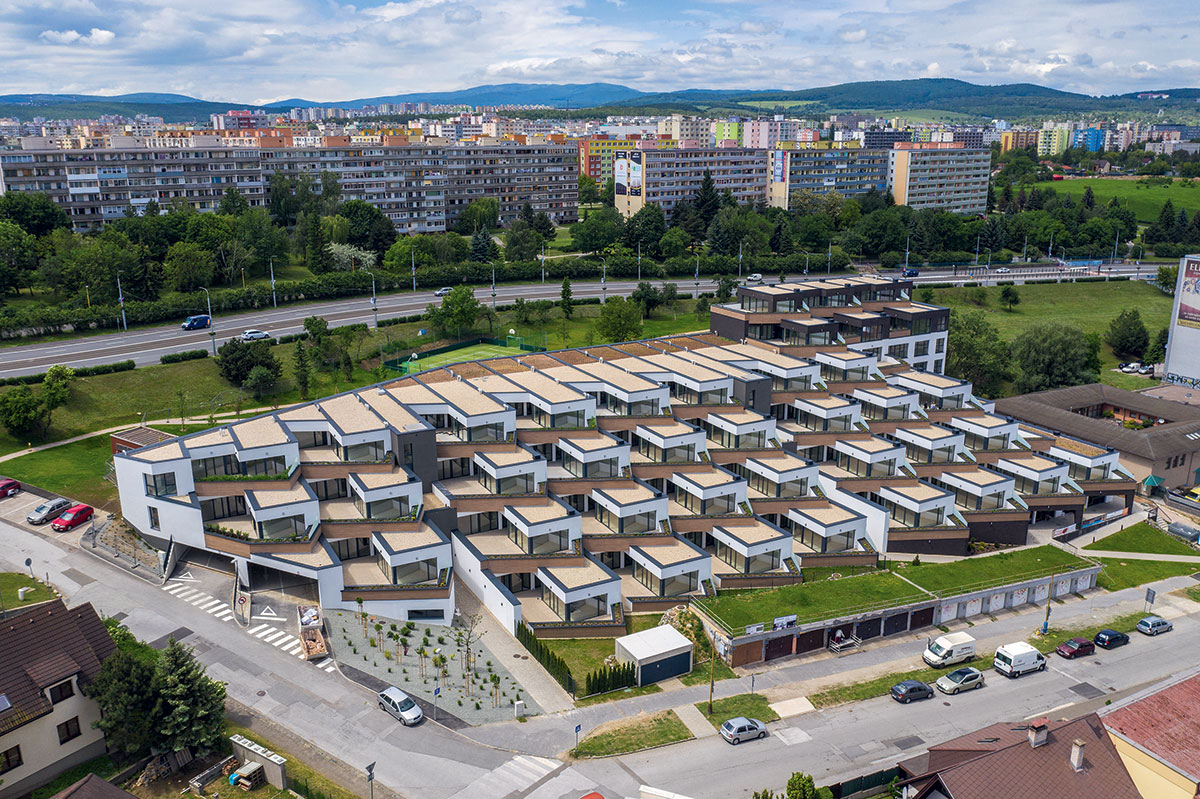 Povrchovú úpravu bytového domu tvorí kombinácia omietok tmavých tvaroviek a imitácie dreveného obkladu s izolačným zasklením.