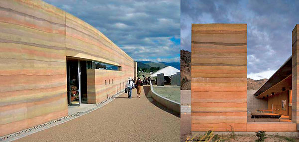 Príklady ubíjaných nosných konštrukcií možno nájsť napríklad v Nemecku – Kaplnka zmierenia v Berlíne (obr. 3) alebo v Kanade – púštne kultúrne centrum v Osoyoos (obr. 4). Ani tento spôsob použitia hliny nie je v Čechách a na Slovensku príliš rozšírený, aj napriek tomu sa v zahraničí v mnohých prípadoch využíva jeho efektu farebných vrstiev, ktoré nepotrebujú ďalšie povrchové ošetrenie.