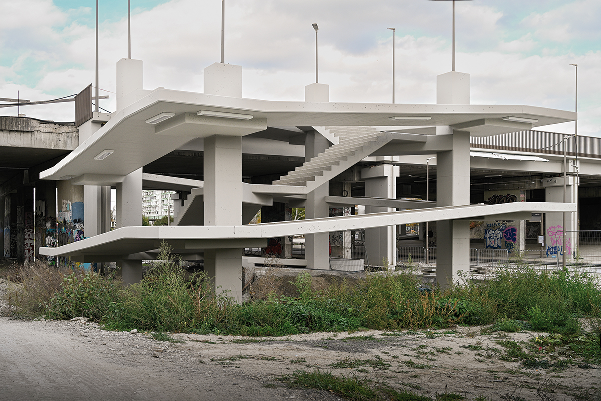 Nosnú konštrukciu tvoria dva samostatné objekty. Rampa je vonkajším obvodom objektu a vytvára pôdorysne štvorec, schodisko vypĺňa vnútrajšok obvodu tvoreného rampami. Každá konštrukcia má samostatnú geometriu a vzhľadom na to aj samostatné stúpanie. Obe sú monoliticky prepojené so stĺpmi.