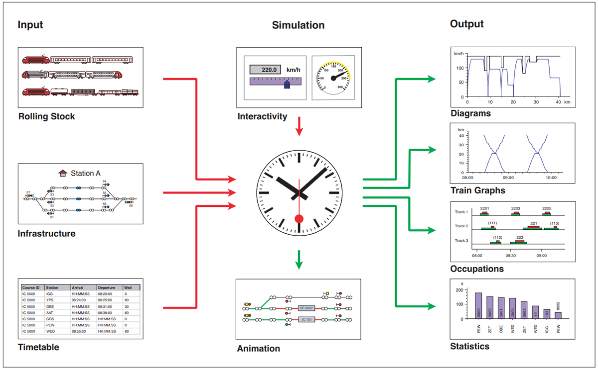 Ďalšie vstupy do simulácie predstavujú vozidlá vrátane ich technických parametrov a dynamických vlastností, ktoré sú definované prostredníctvom trakčnej charakteristiky. Posledným vstupom je samotný cestovných poriadok. Výstupom simulácie sú grafy rýchlostí, obsadenia koľají, nákresné cestovné poriadky a prípadne ďalšie výstupy využiteľné pre kapacitnú analýzu. V tomto prípade bola simulovaná železničná prevádzka bez vplyvu meškaní a mimoriadností.