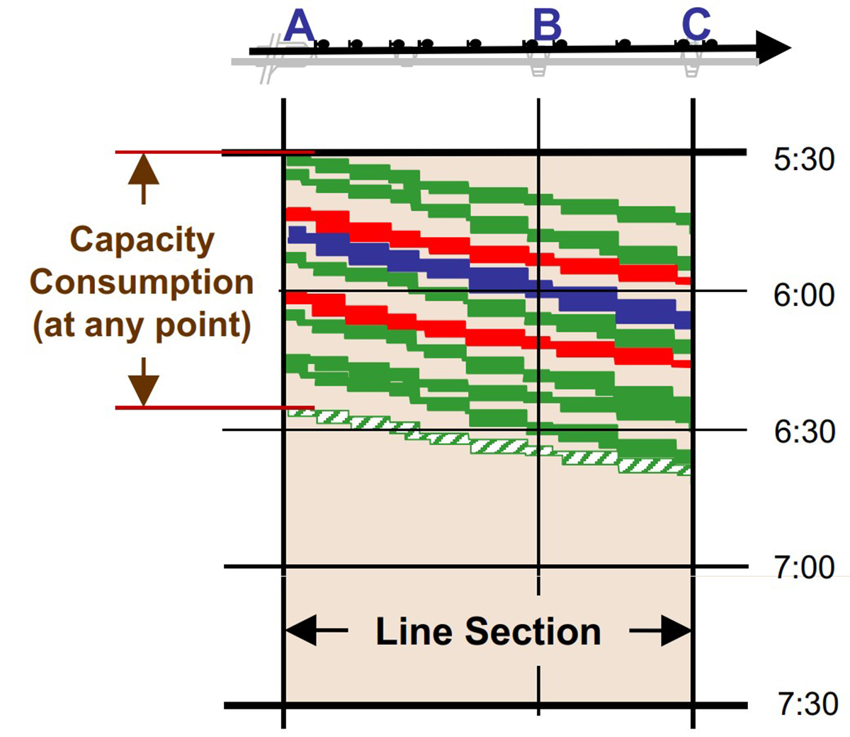 Spotreba kapacity staničných zhlaví bola stanovená v súlade s vyhláškou UIC 406. Metodika je založená na kompresnej metóde, pri ktorej sa časy obsadenia jednotlivých prvkov stlačia na hodnotu prevádzkových intervalov. Výsledkom je tak čas obsadenia posudzovaného úseku infraštruktúry. Princíp zisťovania času obsadenia pomocou kompresnej metódy je uvedený na obr. 6.