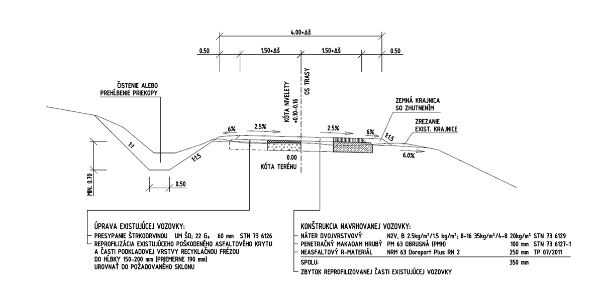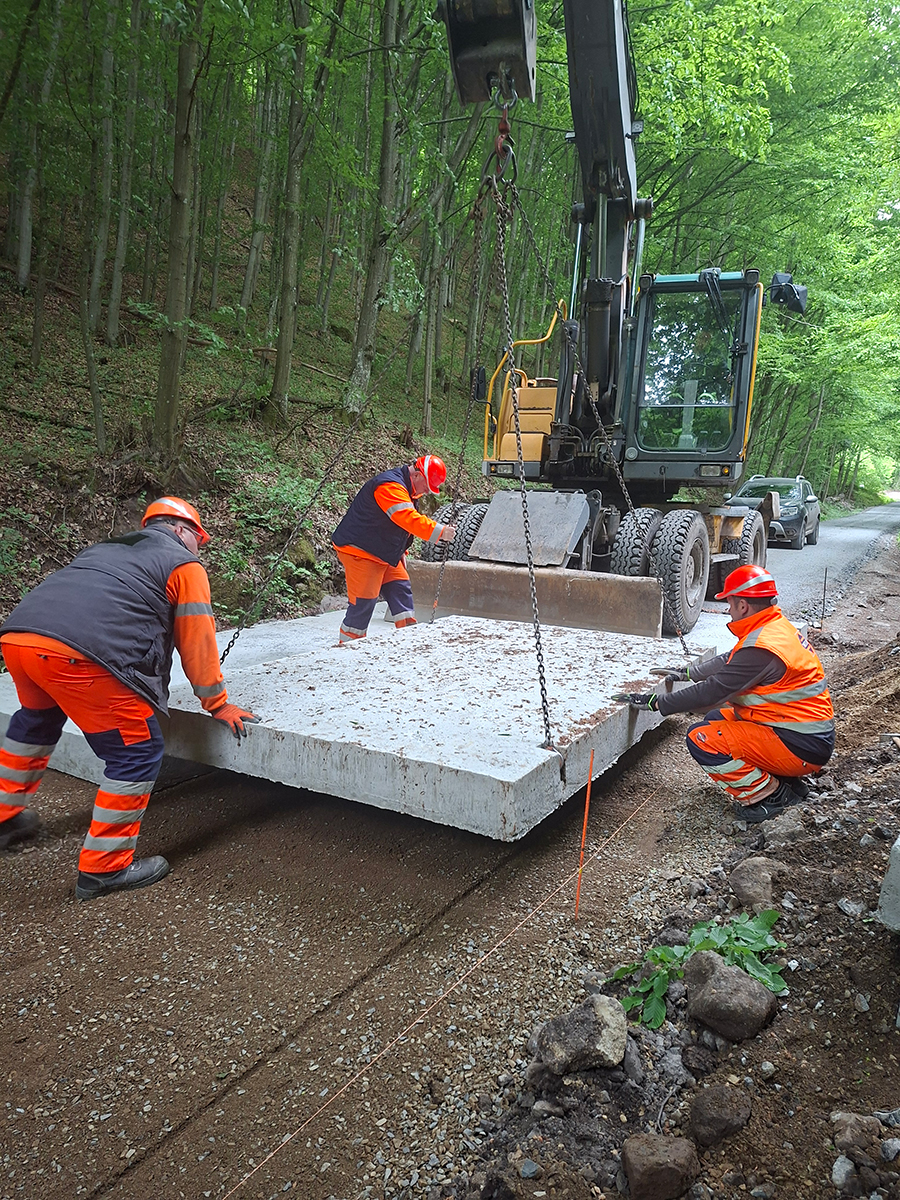 V častiach, kde bude prebiehať približovanie drevnej hmoty, a v miestach lesných skladov bola vozovka vybudovaná z cestných panelov. Celkovo bolo použitých