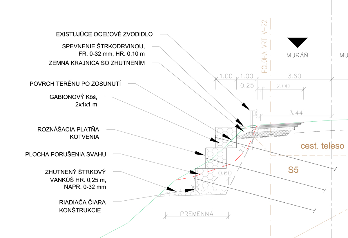 Obr 5a sanácia lokálnej poruchy gabion kotvený kotvami ZUBOR Schema vľavo