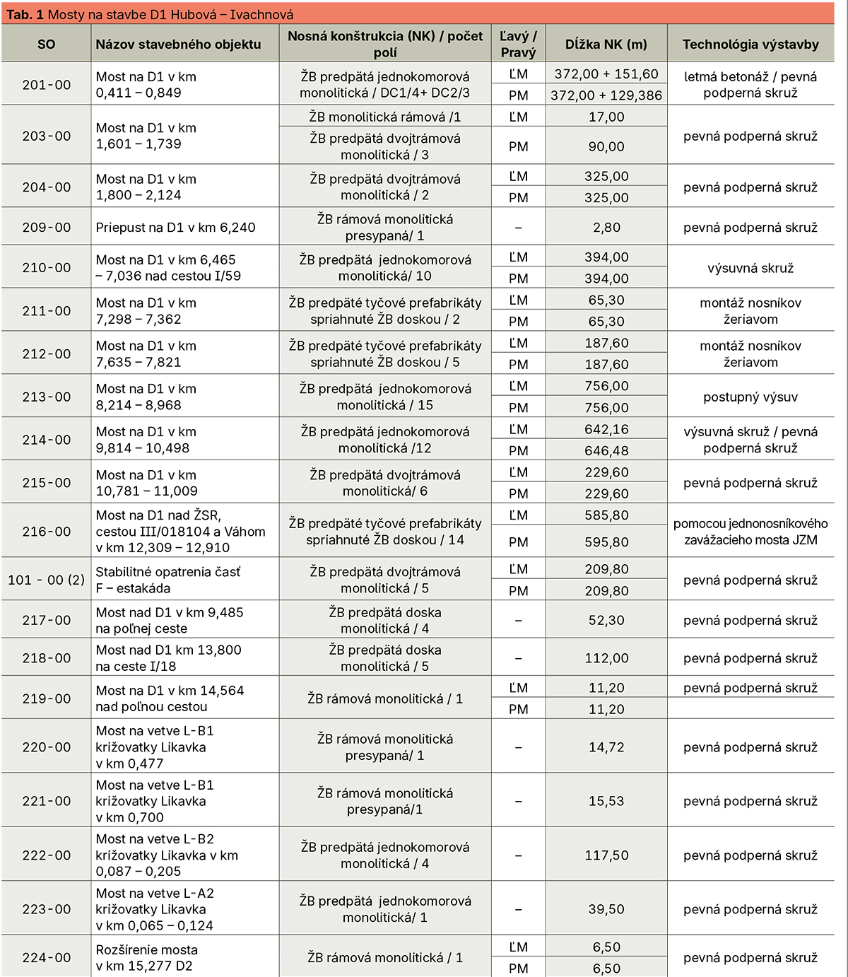 Vzhľadom na rozsiahlosť stavby a zložitosť navrhnutých konštrukcií sa na stavbe aplikovali viaceré výrobné postupy s využitím rôznych výrobných prostriedkov. Na výstavbu mostov sa použili technológie, resp. ich kombinácie podľa tab. 1.