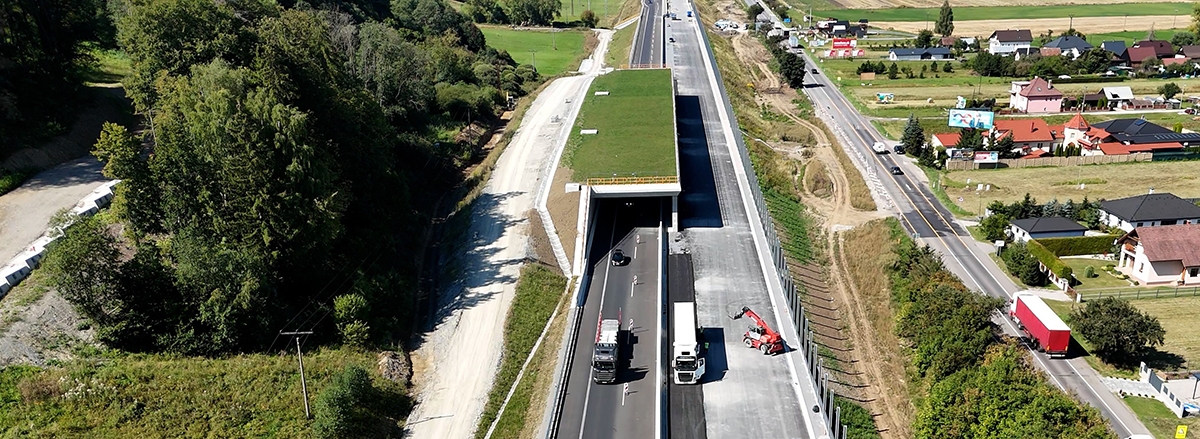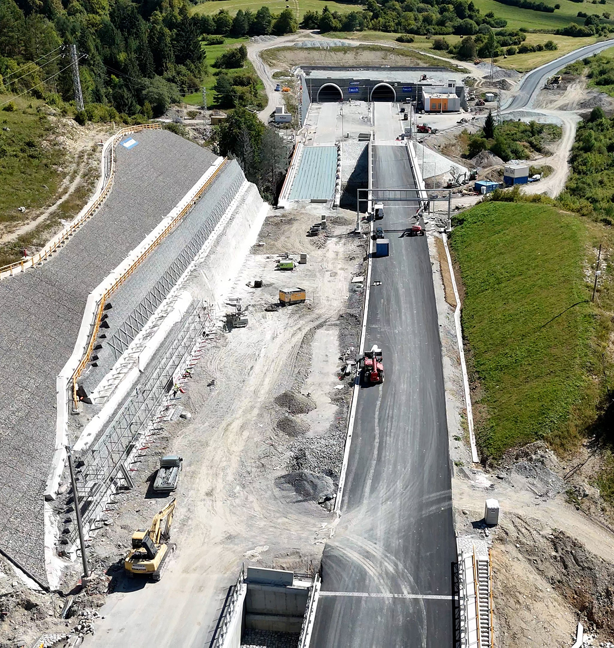 Na stavbe pokračujú aktuálne práce na obrusných vrstvách vozoviek, prebieha montáž protihlukových stien, zábran proti vtákom, oplotenia diaľnice, zvodidiel a portálov dopravného značenia. Realizujú sa finálne úpravy svahov vrátane zahumusovania a vegetačných úprav (obr. 8).