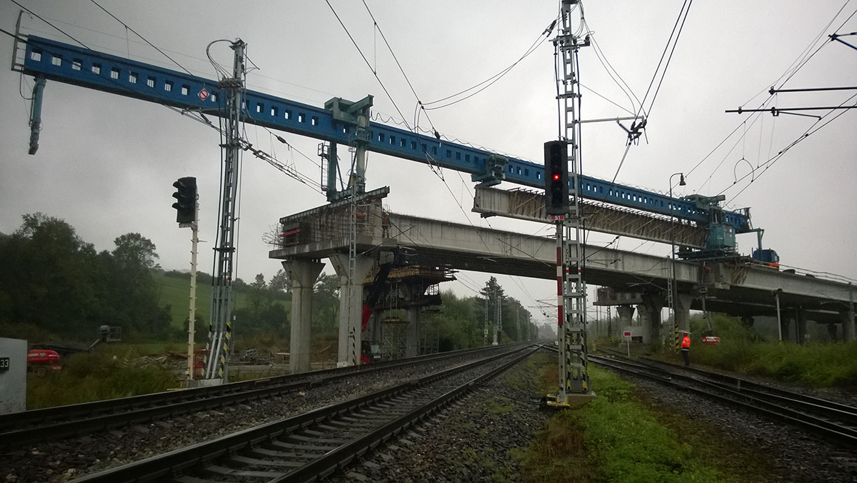 Jedinečná technológia montáže nosnej konštrukcie sa použila napríklad pri moste SO 216-00, ktorý prevádza hlavnú trasu ponad cestu III. triedy v úseku Liptovská Teplá – Lisková, dvojkoľajnú železničnú trať v úseku Lisková – Liptovská Teplá a rieku Váh. Nosnú konštrukciu tvoria železobetónové prefabrikované nosníky v tvare I, dodatočne spínané na stavbe. Ľavý aj pravý most má rovnako 14 polí s rozpätím 33,0 + 12 × 44,0 + 33,0 m na pravom moste a 33,0 + 4 × 44,0 + 4 × 41,5 + 4 × 44,0 + 33,0 m na ľavom moste. Nosníky vyrobila a spínala spoločnosť VÁHOSTAV-PREFA, s. r. o., Horný Hričov, montáž zrealizovalo vlastnou technológiou stredisko mostov spoločnosti VÁHOSTAV (obr. 7).