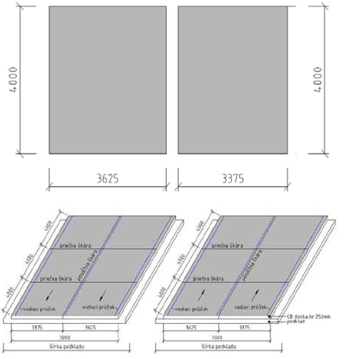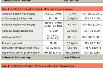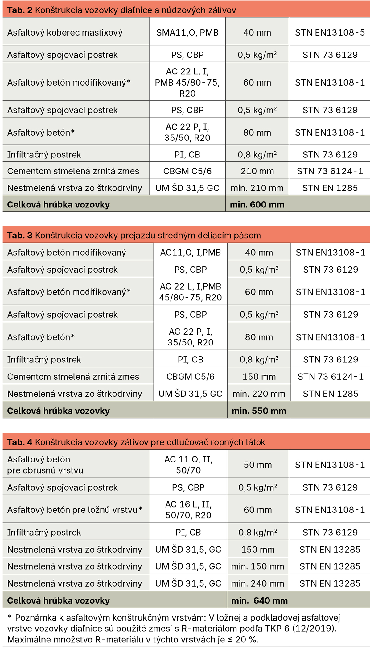 Konštrukcia vozovky diaľnice a núdzových zálivov je zreteľná z tab. 2, konštrukcia vozovky prejazdu stredným deliacim pásom z tab. 3. Konštrukcia vozovky zálivov pre odlučovač ropných látok je uvedená v tab. 4.