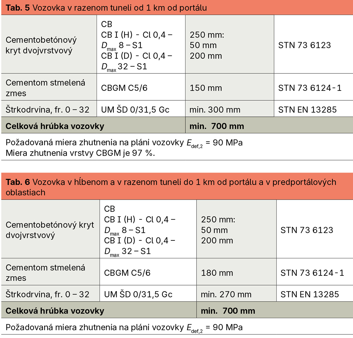 Z porovnania asfaltových a cementobetónových vozoviek je zrejmé, že jednotlivé časti úseku si vyžadujú rozdielne konštrukčné riešenia. Povrchové vrstvy mimo tunela sú navrhnuté ako polotuhé živičné konštrukcie s použitím modifikovaných asfaltových zmesí a R materiálu, čo zvyšuje ich odolnosť a zároveň reflektuje požiadavky na udržateľnosť.