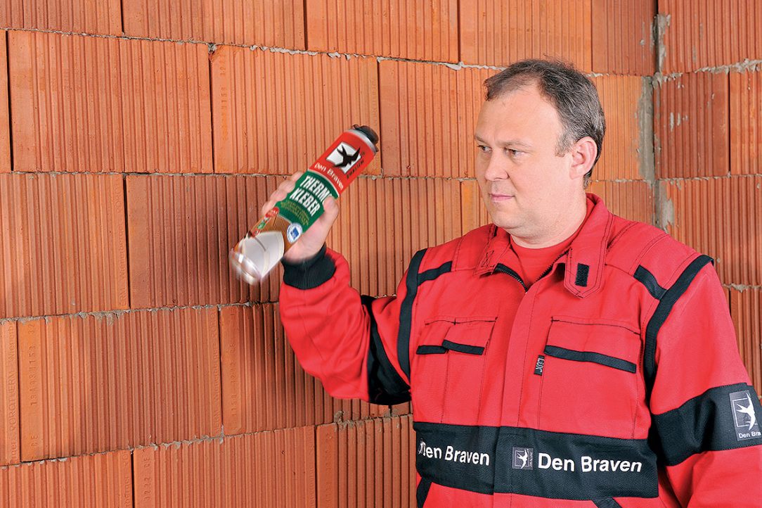 Na pripravený podklad je možné začať lepiť tepelnoizolačné dosky na báze EPS. Dóza nízkoexpanznej polyuretánovej peny sa naskrutkuje na aplikačnú pištoľ s NBS závitom a dôkladne sa pretrepe (min. 30-krát). Aretačnou skrutkou sa nastaví požadované dávkovanie. Koniec trubice pištole sa nesmie pri aplikácii PUR lepidla dotýkať priamo podkladu/tepelnej izolácie.