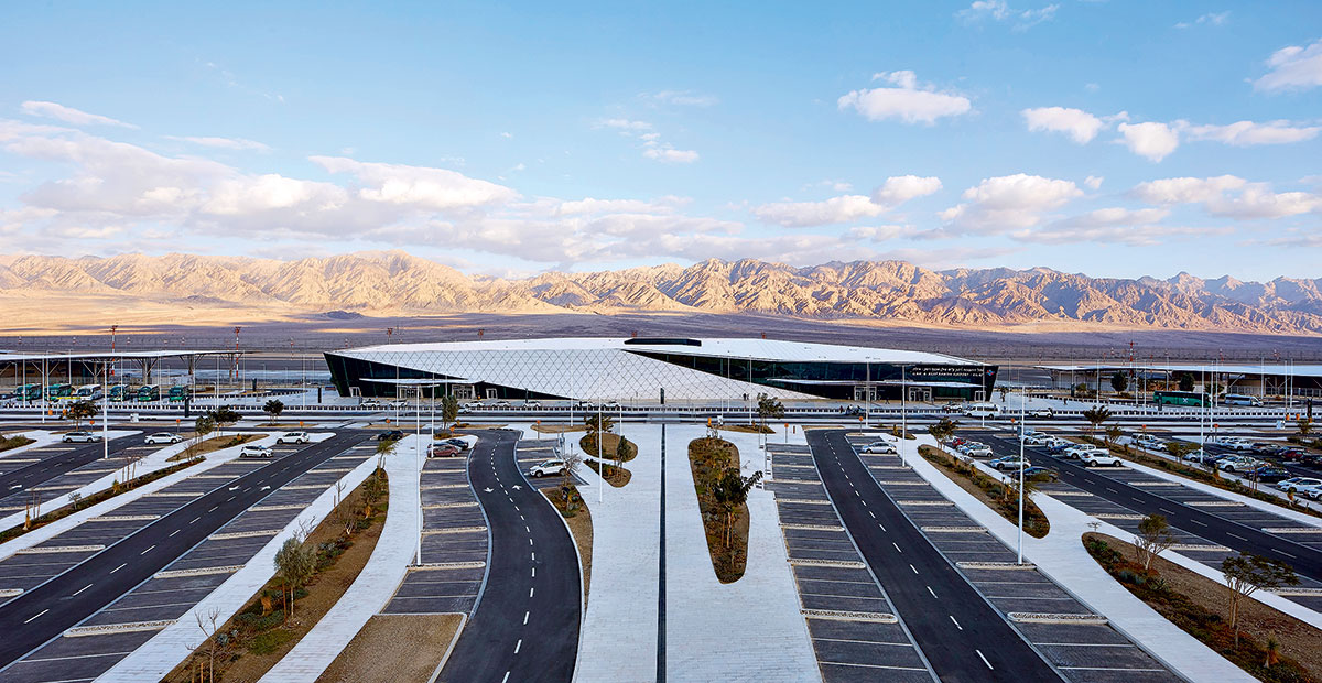Vyschnutá delta riek Nimra a Raham sa stala základom pre rozvrhnutie prístupových ciest a napojenie na cestnú a železničnú dopravu. Parkoviská sú organicky zvlnené, rešpektujú zárezy, ktorými kedysi tiekla voda, a otvárajú sa do šírky tam, kde leží letiskový terminál aj s technickým zázemím po svojej severnej a južnej strane.