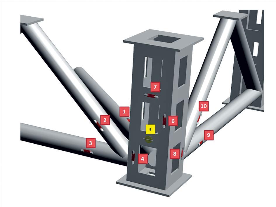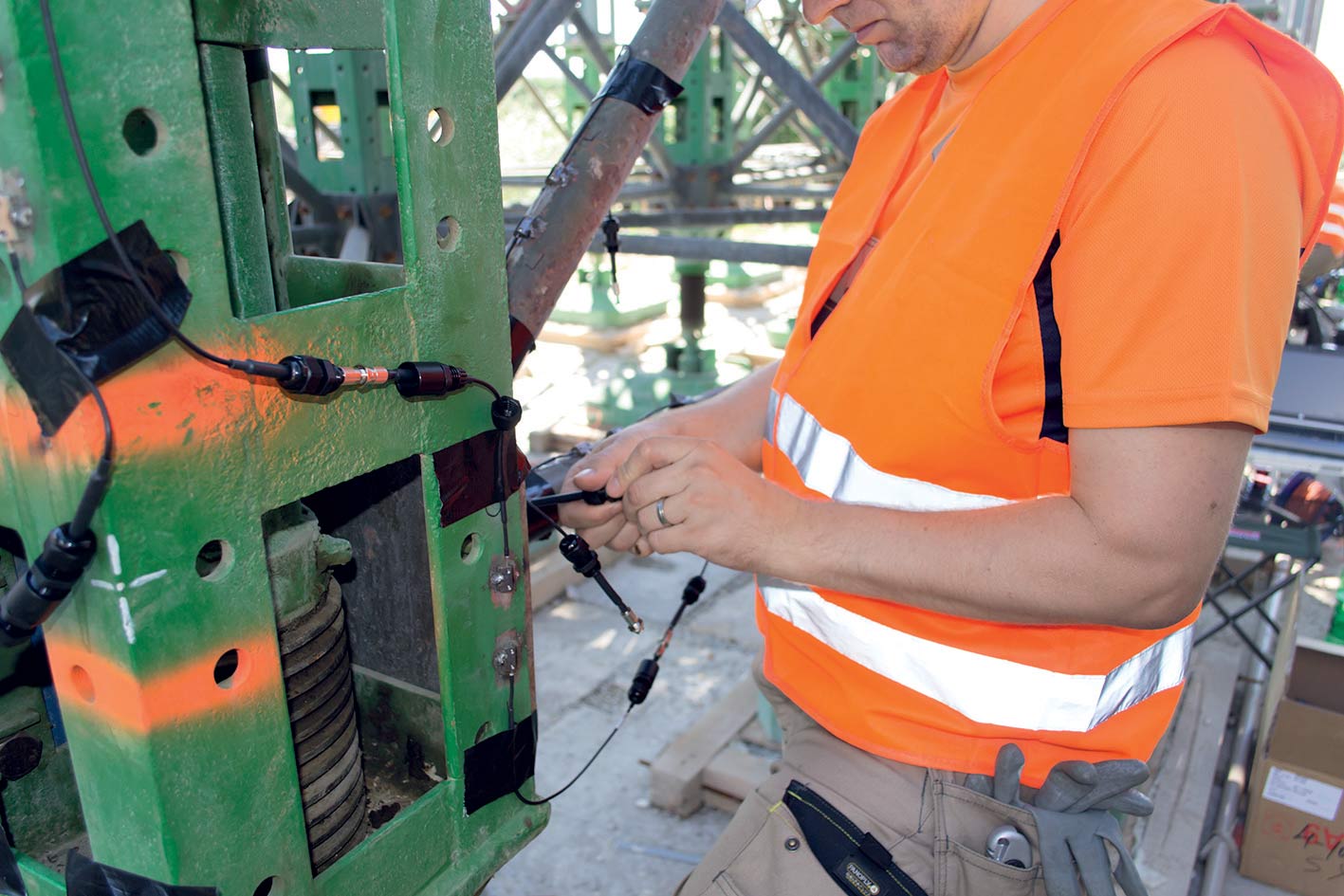 Merania sa začali o 5.00 hod. ráno za pomerne chladných podmienok. Počasie počas dňa bolo striedavé, slnečno-oblačné. Slnečné lúče dopadajúce na konštrukciu ovplyvnili vlastnosti materiálu, ktoré boli filtrované teplotnými sondami. Na konci dňa po vyliatí požadovaného objemu betónu ostali všetky merané body v limitoch tak, ako ich definovala firma TOOŽ. Optovláknové snímače sa inštalovali na podpornú konštrukciu Pižmo pozostávajúcu z bloku 3 × 8 podporných stojok, a to v rohoch konštrukcie, ako aj na strednom páse 3 stojok konštrukcie. Monitorovacia sieť bola zložená zo 48 optovláknových snímačov, z ktorých 42 slúžilo na meranie mechanického napätia a zvyšných šesť teplotných snímačov na teplotnú kompenzáciu. Od jednotlivých podporných stĺpov viedli jeden alebo dva pancierové optické 3-milimetrové káble k prepojovaciemu boxu, ktorý bol priamo napojený na distribučný 500-metrový kábel. Distribučný kábel sa následne pripojil k vyhodnocovaciemu zariadeniu – interrogátoru. V priebehu prvého dňa inštalácie sa na podpornej konštrukcii Pižmo vyznačili presné umiestnenia snímačov. Všetky pozície sa očistili a z konštrukcie sa odstránil vrchný náter z dôvodu potreby zvárania držiakov snímačov na konštrukciu. Následne sa navarili držiaky a inštalovali prvé dve senzorické siete. Na druhý deň sa doinštalovali chýbajúce senzorické siete a naťahala sa kabeláž od jednotlivých sietí do centrálneho bodu, kde bol umiestnený prepojovací box. Po inštalácii a odskúšaní všetkých snímačov sa vykonala ich výstupná kontrola. Potom sa snímače zadefinovali v príslušnom softvéri, čo umožnilo zaznamenávať informácie nielen vo vlnových dĺžkach, ale aj vo fyzikálnych veličinách, napríklad MPa. Dva týždne pred nasadením optických káblov prebiehalo meranie konštrukcie konvenčným spôsobom pomocou elektrického snímača. Pracovníci firmy TOOŽ spolupracovali s prof. J. Benčatom zo Žilinskej univerzity v Žiline, ktorý vykonával tieto merania na niekoľkých bodoch. Výsledky sa porovnali s meraním pomocou optických snímačov a ukázali veľmi podobné výstupy za mierne zmenených podmienok. Obe merania potvrdili, že konštrukcia je dostatočne odolná a z hľadiska bezpečnosti stavby tohto typu až mierne predimenzovaná. Zároveň sa potvrdila správnosť merania optickými káblami a spoločnosť TOOŽ plánuje túto metódu využiť pri plánovaní svojich budúcich projektov. Z nákladovej štúdie vyplýva, že celkové náklady na monitorovanie uvedenej konštrukcie predstavovali približne 30-tisíc eur, čo je zanedbateľná položka v porovnaní s cenou ľudského života či nákladmi na rekonštrukciu nekvalitne zhotovených stavieb.