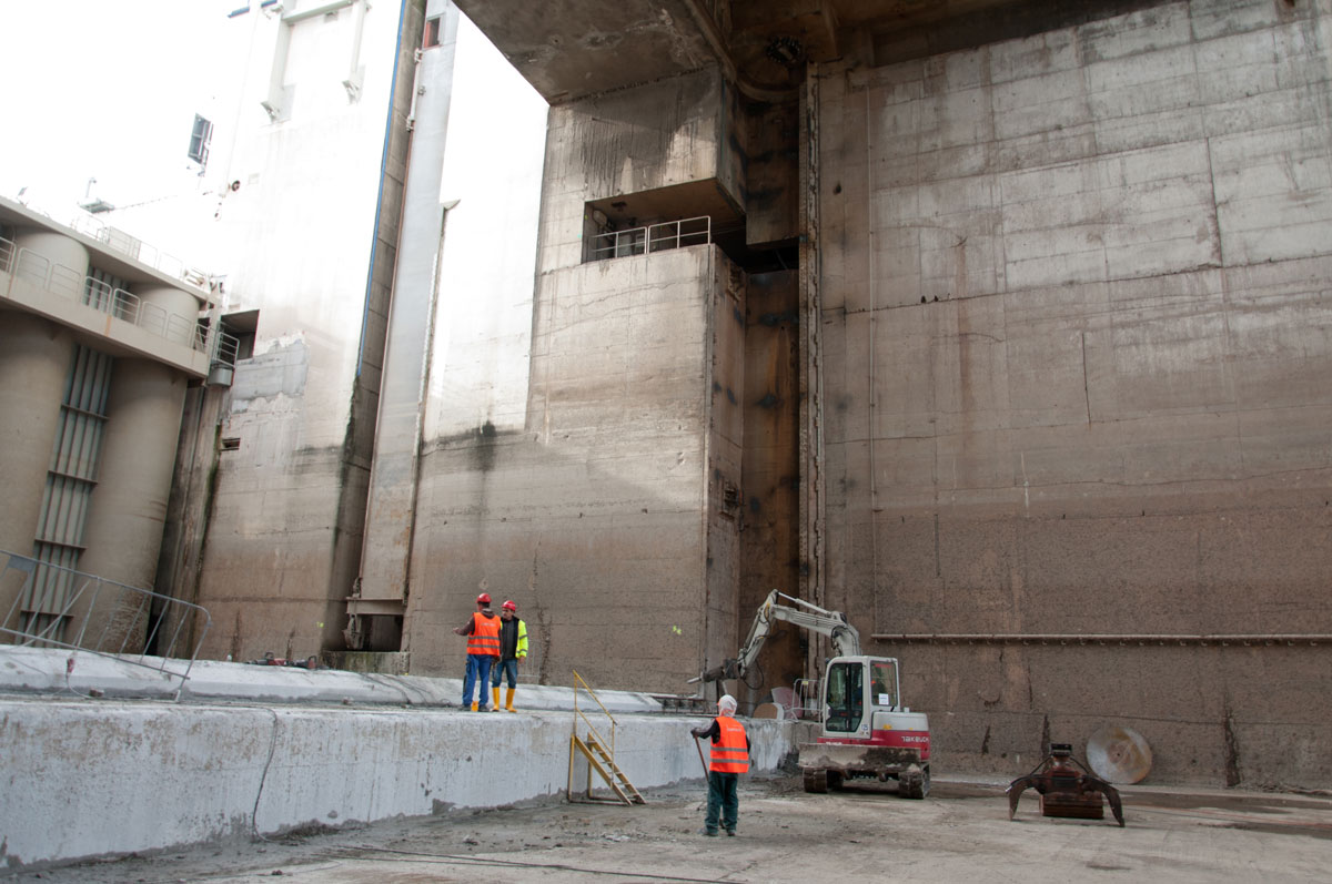 elezobetónová konštrukcia ktorá zostala po demontáži vrát pravej plavebnej komory sa odbúrava čiastočne strojovo a čiastočne manuálne.