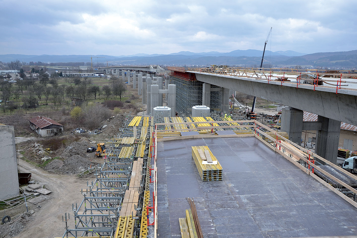Výstavba nosnej konštrukcie je kombináciou technológie postupného vysúvania nosnej konštrukcie (DC1) a technológie budovania na podpornej skruži (DC2). Pre potreby výsuvu nosnej konštrukcie mosta DC1 bolo potrebné zriadiť pred oporou č. 1 výrobňu, ktorá slúži na výstavbu jednotlivých taktov nosnej konštrukcie vysúvaných do definitívnej polohy. Ide o železobetónovú konštrukciu pozostávajúcu z pásov v tvare obráteného T, priečne spojených priečľami. Súčasťou výrobne sú aj dočasné piliere, ktoré sú s výrobňou a oporou č. 1 spojené železobetónovými pásmi. Dočasné piliere a výrobňa sú založené plošne na štrkovom zhutnenom a konsolidovanom násype.