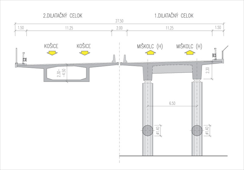 Tyčové prefabrikáty s koncovými priečnikmi sú spriahnuté monolitickou doskou s priemernou hrúbkou 220 mm. Nosníky sú nad medziľahlou podperou spojené bezdilatačným stykom. V pozdĺžnom smere tak vytvárajú dve prosté polia. Nosníky sú uložené priamo na elastomérové ložiská.