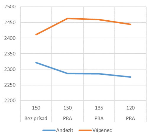 Obr. 4 Závislosť zhutnenej objemovej hmotnosti od teploty zhutňovania a druhu kameniva