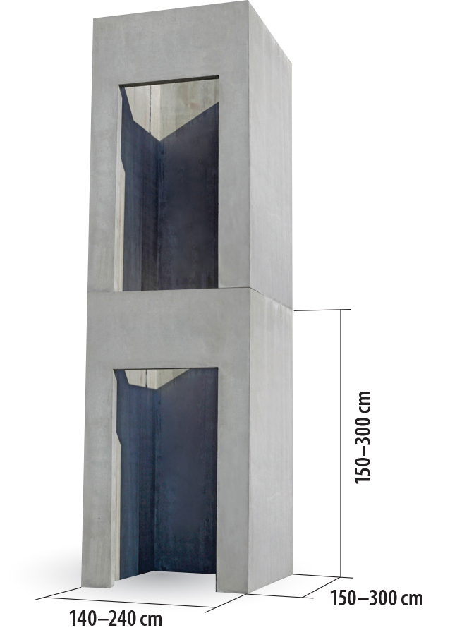 Je totiž navrhnutá presne podľa požiadaviek stavby, pričom je možné ju vyrobiť v uzavretom tvare, ktorý slúži na dojazd výťahu alebo v otvorenom tvare “U“. Ďalšou výhodou je možnosť zabudovania výstuže, ktorá zaručene obmedzí hlučnosť výťahu. Množstvo tejto výstuže zadáva statik stavby.