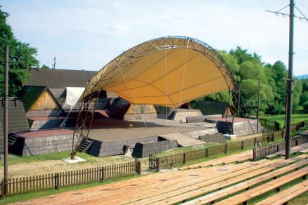 | Obr. 8 Dočasná konštrukcia membránového zastrešenia javiska amfiteátra v Detve [11] | Obr. 9 Efektné membránové konštrukcie s názvom SkySong nachádzajúce sa v areáli Štátnej univerzity v Arizone [12] |