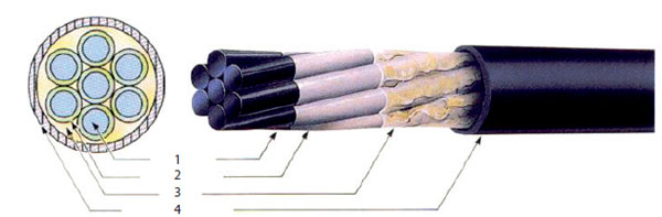 1 – prameň, 2 – vrstva epoxidovej živice, 3 – mazivo, 4 – polyetylénový plášť