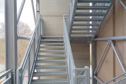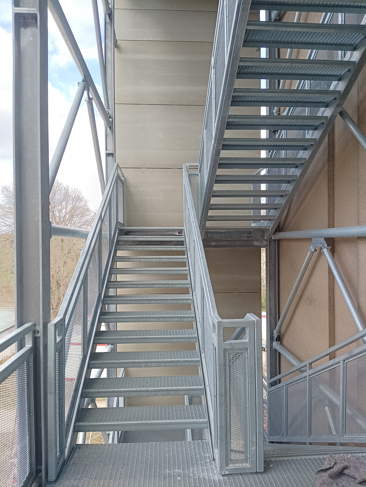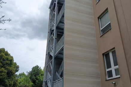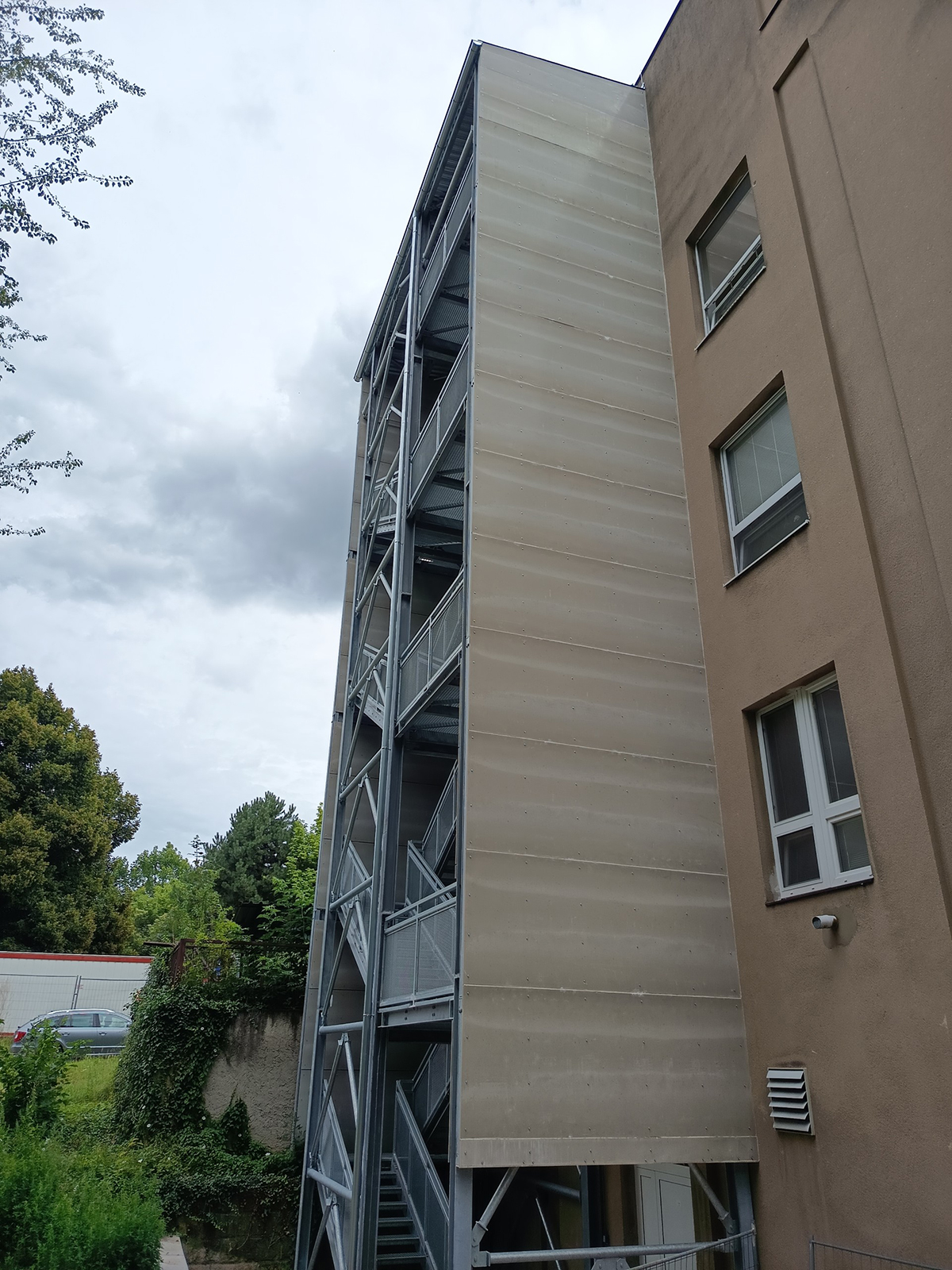 Pri evakuačnom schodisku bola pre obklad požadovaná požiarná odolnosť v triede EI 30 DP1. Na splnenie tohto kritéria bola zrealizovaná overená skladba jednostranného obkladu z dvoch cementotrieskových dosiek CETRIS® BASIC s hrúbkou 12 mm, kotvených na oceľovú konštrukciu.