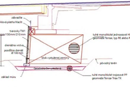 - vnútorný priestor dvojstranného múru je celý vystužený tuhými monolitickými HDPE geomrežami Tensar.