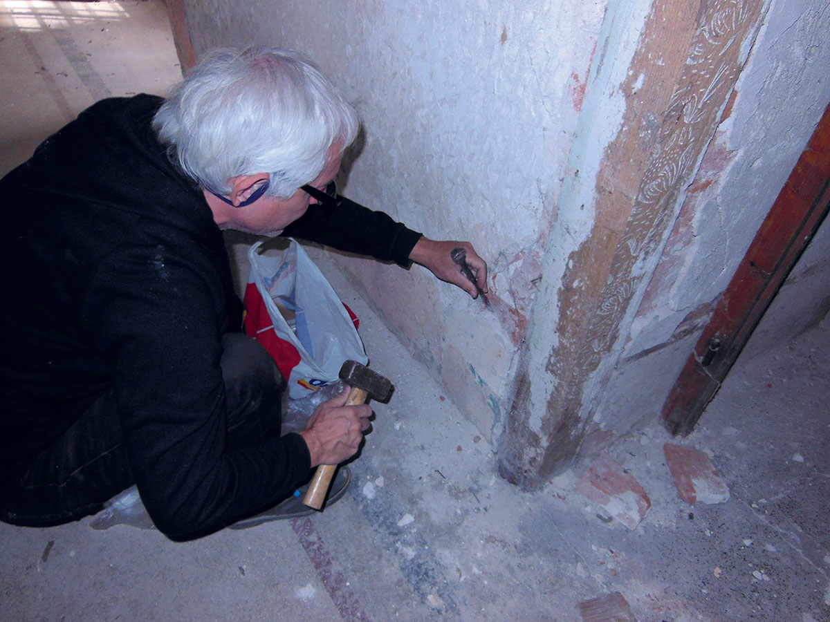 Obr. 1 Deštruktívny odber vzorky na inštrumentálnu laboratórnu analýzu omietky.
