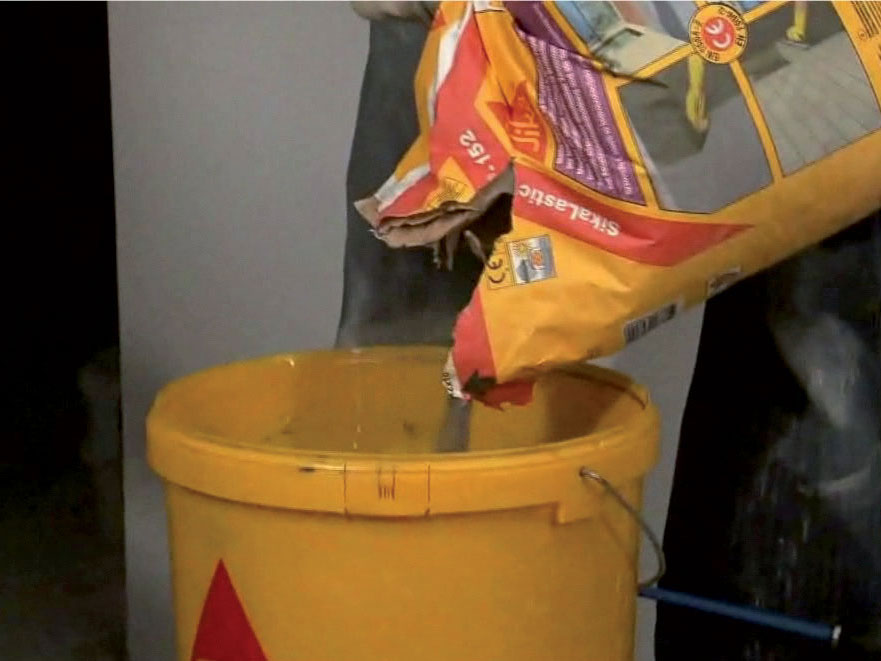 - Náradie a pomôcky: ochranné rukavice, kefa, štetka na očistenie povrchu, plastová nádoba, nízkootáčkové elektrické miešadlo (500 ot./min.), oceľové zubové hladidlo (veľkosť zuba: 3 × 3 mm)