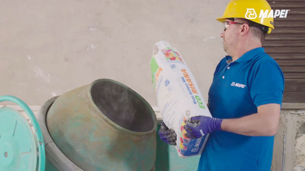 Odstránia sa všetky zvyšky nesúdržného materiálu, prachu, plesní a ďalších látok, ktoré by mohli narušiť priľnavosť omietky na podklad. Murivo sa umyje vodou pod nízkym tlakom, aby sa odstránili výkvety alebo rozpustné soli prítomné na povrchu. Nerovnosti v podklade sa vyplnia. | Zdroj: Mapei