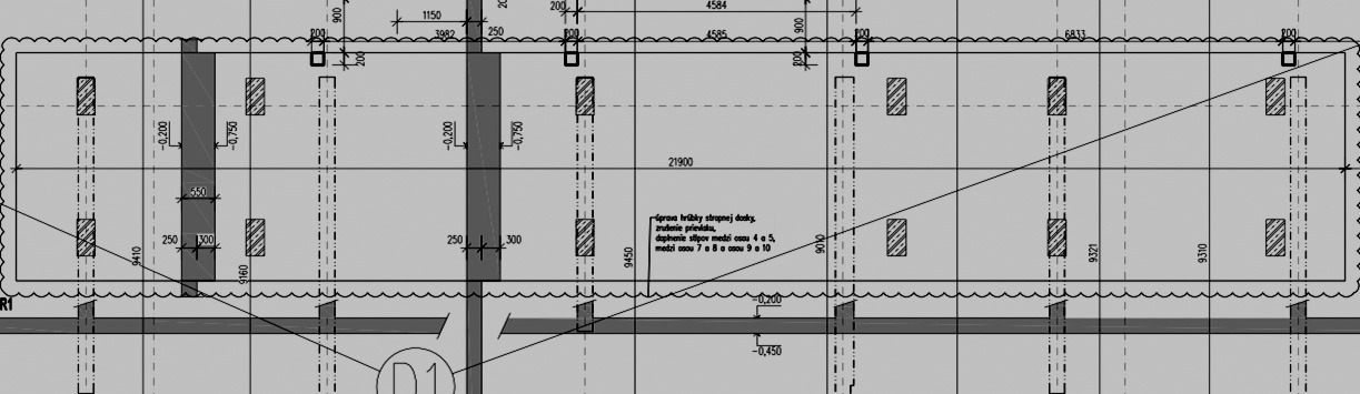 Obr. 1 Riešenie zmeny nosného systému zo stĺpového na stenový v stropnej konštrukcii pomocou obmedzeného zhrubnutia časti stropnej konštrukcie