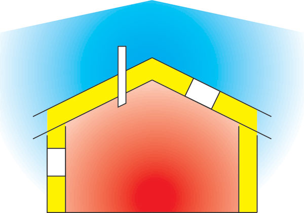 | Obr. 19 Reflexia sálavého tepla – úspora energie Doplňujúcim prvkom zníženia energetickej náročnosti budovy je aplikácia parotesných zábran s hliníkovou vrstvou doplnených o konštrukčnú medzeru s hrúbkou okolo 3 cm pred reflexnou stranou otočenou do interiéru. Sálavá zložka tepla tvorí asi 70 % a jediná je schopná odrážať sa od reflexných povrchov. Kvalitné parotesné zábrany majú reflexiu nad 90 % a možno nimi zásadne znížiť prienik tepla cez konštrukcie. Nevyhnutnosťou je „odrazová“ medzera. V prípade použitia fólie priamo pod sadrokartón je efekt takmer nulový. |