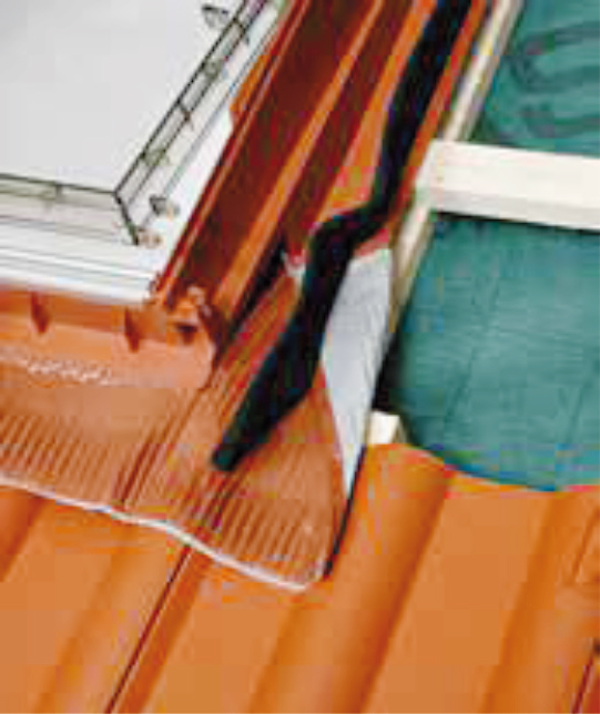 Lepiaci okraj lemovania strešného okna sa vyformuje podľa tvaru strešnej krytiny, pričom sa začína od stredu lemovania v najvyššom mieste krytiny. Vyformovaný okraj sa dôkladne pritlačí. Podklad musí byť čistý, suchý, bez prachu. Lemovanie strešného okna sa v mieste lepiaceho okraja dodatočne pritlačí valčekom. Pri väčších rozstupoch medzi krokvami sa okno pripevní na strešné laty štyrmi pomocnými popruhmi (pričom je potrebné strešné laty podoprieť doplnkovou latou). Strešné okno sa potom pripevní na podpornú latu. Po pripevnení okna sa uložia z obidvoch strán okna škridly, ktoré je potrebné pripevniť skrutkami na strešné laty. Pred uložením škridiel je potrebné odstrániť závesné nosy škridiel nad lemovaním strešného okna.