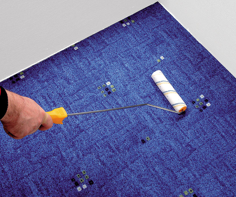 Po piatich až desiatich minútach sa na podklad s nanesenou vrstvou lepidla prilepí podlahová krytina (koberec, resp. krytina PVC). S lepením koberca sa začína od vnútorného kraja miestnosti smerom k dverám. Podlahová krytina sa pritlačí k podkladu a lepený spoj je potrebné zaťažiť. Nalepenú podlahovú krytinu treba vyrovnať pomocou valčeka. Čas vytvrdnutia lepidla je 24 až 72 hodín.