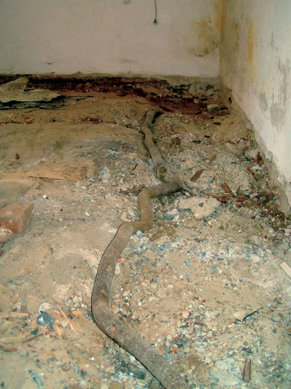 Použitá fotodokumentácia je z realizácie sanácie starého rodinného domu z roku 1895. Steny zo zmiešaného muriva (pálená tehla, nepálená tehla, kameň) poškodzovali účinky vzlínajúcej vlhkosti, ktorá rozrušovala interiérové aj exteriérové povrchové úpravy do výšky asi 60 cm od podlahy. Pre zlú stabilitu nosných stien sa majitelia rozhodli pre sanáciu, pri ktorej nedochádza k priamemu zásahu do nosných konštrukcií stien. Z vonkajšej strany objektu sa zrealizovala drenáž, v interiéri prevetraná dutinová podlaha.