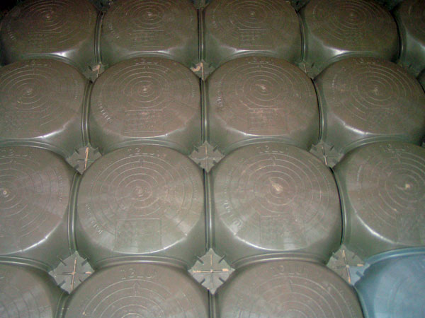 Na rozložené tvarovky sa položí zváraná sieťovinová výstuž 100/100/4 mm alebo 150/150/5 mm (obr. 8), ktorej presah pri stykovaní musí byť minimálne jedno pole, teda 100 (150) mm. Výstuž sa zaleje betónom v minimálnej hrúbke 30 mm (obr. 9). Návrh hrúbky železobetónovej dosky, ako aj typ armatúry závisí od budúcej prevádzky objektu.
