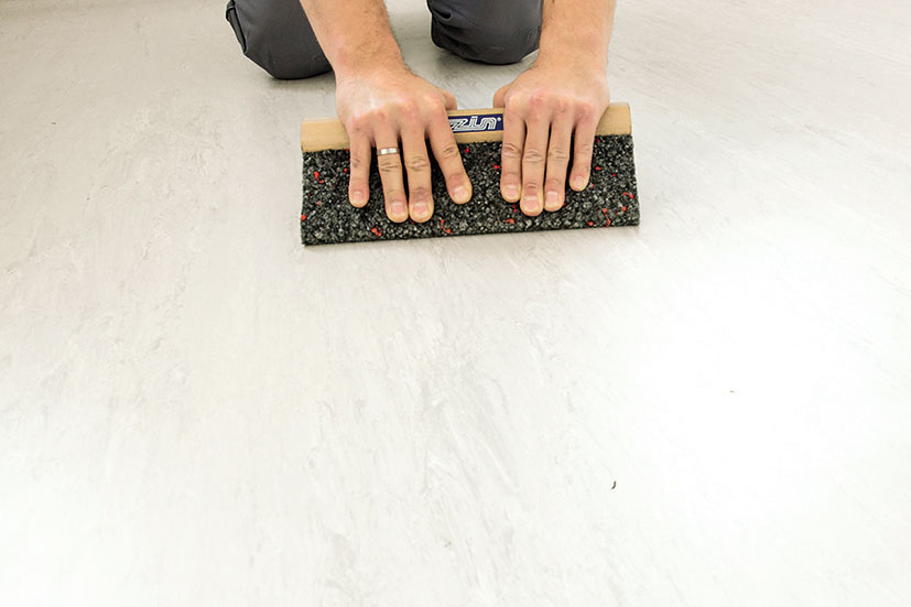 Následne možno ihneď začať s kladením samotnej podlahoviny. Podlahovina sa rozloží. Konce podlahových pásov sa zrežú nahrubo, pozdĺžne švíky presne. Polovica pásu sa potom preloží naspäť.