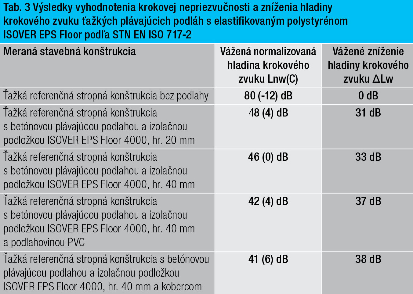 Tab. 3 Výsledky vyhodnotenia krokovej nepriezvučnosti a zníženia hladiny krokového zvuku ťažkých plávajúcich podláh s elastifikovaným polystyrénom ISOVER EPS Floor podľa STN EN ISO 717 2