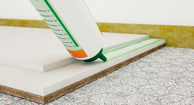 Podlahové prvky sa musia v priebehu desiatich minút vzájomne zoskrutkovať alebo zosponkovať. Inak dôjde k vypeneniu lepidla a nadvihnutiu prvku. Maximálne vzdialenosti spojovacích prostriedkov sú 15 cm (cementovláknité dosky pri použití skrutiek a sponiek alebo sadrovláknité podlahové prvky pri použití sponiek) až 20 cm (sadrovláknité podlahové prvky pri použití rýchlorezných skrutiek). Po vytvrdnutí podlahového lepidla približne po 24 hodinách sa odstránia jeho vytečené zvyšky škrabkou na lepidlo, špachtľou alebo dlátom. V priebehu kladenia sú podlahové prvky pochôdzne, treba sa však pohybovať opatrne. Plné zaťaženie je možné až po vytvrdnutí podlahového lepidla.