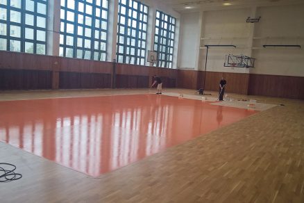 Po dokončení montáže podlahy sa nanovo zameralo hlavné ihrisko. Vymedzený priestor s plochou 162 m2 sa dôkladne prebrúsil diamantovým brúsnym papierom so zrnitosťou P240. Prebrúsenú a očistenú plochu je vhodné ohraničiť páskami s nízkou lepivosťou.