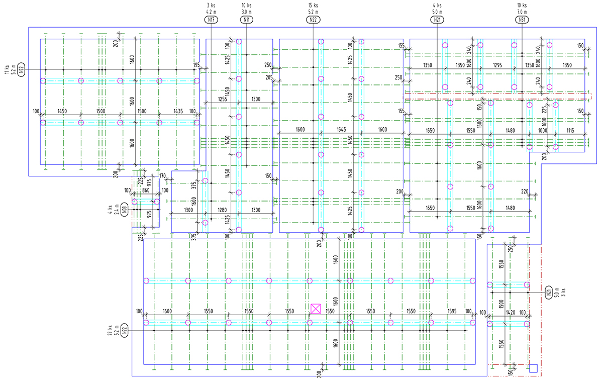 Posledný výkres je schéma rozmiestnenia podpernej konštrukcie stropu, tu sú rozkreslené zvislé stojky a horizontálne podperné trámy.