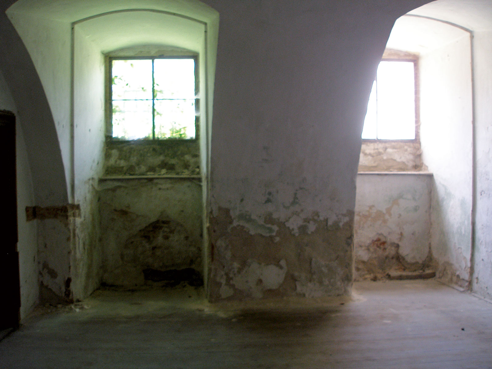 Obr. 1 Vlhkosťou a soľami zničená povrchová vrstva omietok v suteréne kaštieľa