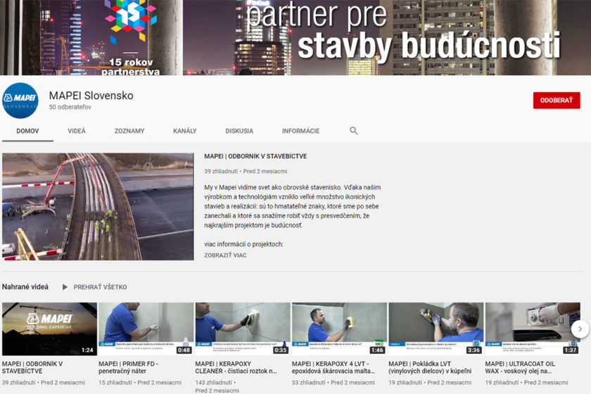 Cieľom YouTube kanálu Mapei Slovensko je predovšetkým vzdelávať a priniesť zákazníkovi užitočné informácie. Jednotlivé videá krok za krokom ukazujú, aké výrobky Mapei treba pri jednotlivých riešeniach použiť, ako s nimi pracovať a na čo pri ich aplikácii nezabudnúť.