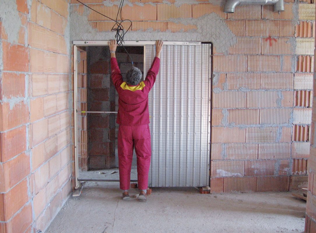 Hrubý stavebný otvor sa pripraví v závislosti od šírky čistého priechodu. Výška stavebného otvoru sa pripraví na úroveň dokončenej podlahy (dlažba, plávajúca podlaha). Do otvoru sa vloží preklad a vyhotovia sa výseky na kotviace plechy podľa ich polohy na drevenej stojine a na zadnej strane plechovej kapsy.