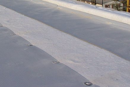 | Obr. 3 Následky nesprávne aplikovanej homogénnej fólie, ktorá sa nezabezpečila proti vnútorným silám | Obr. 5 Mechanicky kotvená heterogénna mPVC fólia |