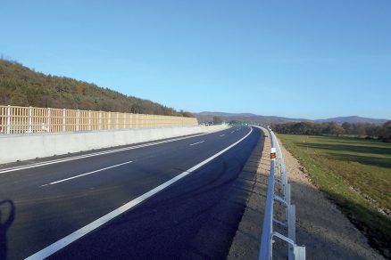 Klopenie vozovky je navrhnuté okolo vonkajších okrajov vnútorných vodiacich prúžkov. Na fotografii vidieť aj protihlukovú stenu.