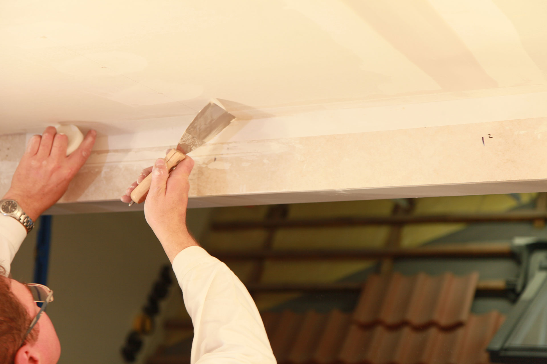Do vrstvy tmelu sa vloží výstužná sklovláknitá páska a zľahka sa pretiahne špachtľou s tenkou vrstvou tmelu. Sploštené hrany dosiek uľahčujú základné tmelenie, keďže tmel s páskou sa nanáša len do vybratia hrán dosiek. | Zdroj: Saint-Gobain Construction Products