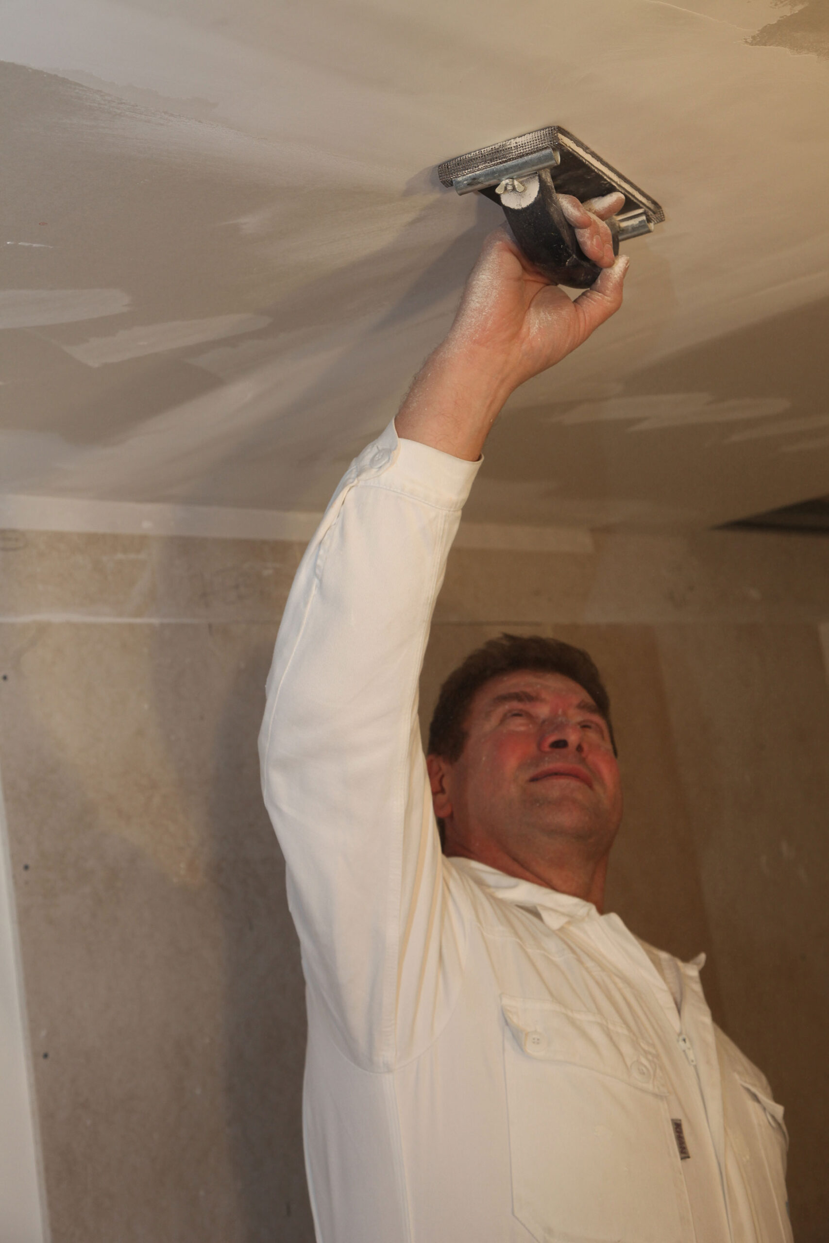 Po zaschnutí tmelu sa povrch prebrúsi brúsnou mriežkou pripevnenou do ručného držiaka. Treba dať pozor, aby sa neporušila výstužná páska ani priliehajúci povrch kartónu sadrokartónových dosiek. Podhľad je pripravený na maľovanie. | Zdroj: Saint-Gobain Construction Products
