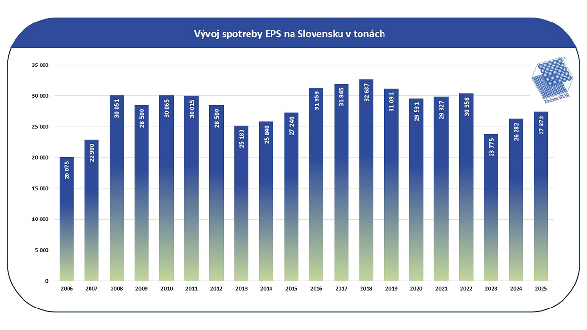 Spotreba expandovaného polystyrénu (EPS) na Slovensku v roku 2025 dosiahla 27 372 ton, čo predstavuje medziročný nárast približne o 4 %. Najväčší podiel spotreby dlhodobo smeruje do stavebníctva, kde EPS zohráva kľúčovú úlohu pri znižovaní energetickej náročnosti budov. Zateplenie patrí medzi najúčinnejšie opatrenia na úsporu energií a zvýšenie kvality bývania. Tento trend potvrdzujú aj skúsenosti z dotačných programov, v ktorých dominuje práve záujem o zateplenie.
