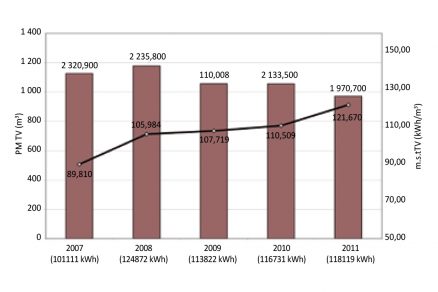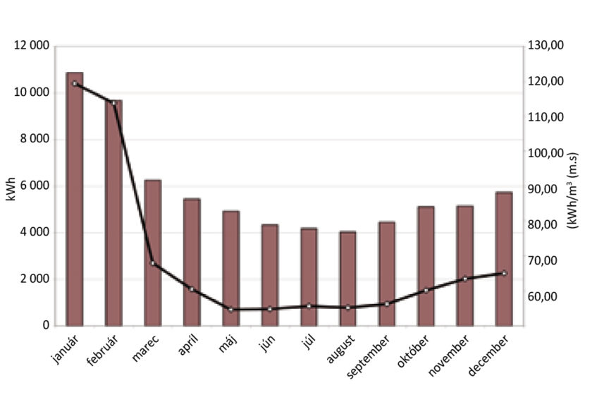 Výsledné hodnoty mernej spotreby tepla na prípravu teplej vody za jednotlivé mesiace roka 2012 uvádzame v grafe na obr. 4. Zníženie mernej spotreby tepla na prípravu teplej vody sa naplno prejavilo až v máji 2012 a oproti januáru 2012 predstavovalo 54,2 %. Najnižšia merná spotreba tepla po výmene rozvodov sa zaznamenala v auguste 2013, kedy sa na ohrev 78 m3 studenej vody spotrebovalo 4 111 kWh tepla, t. j. 52,705 kWh/m3.