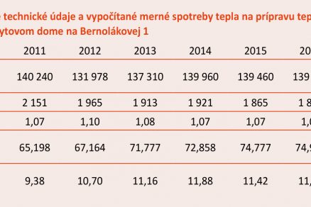 V nočných hodinách bola spotreba teplej vody na úrovni 5,87 % z celkovej mesačnej spotreby. Pretože pri 24-hodinovej dodávke teplej vody sa náklady na jej prípravu zvýšili len nepatrne, vlastníci bytov sa rozhodli pre takúto dodávku. V tab. 2 sú uvedené namerané technické údaje a vypočítané merné spotreby tepla na prípravu teplej vody za roky 2011 až 2017 v bytovom dome na Bernolákovej 1. Namerané hodnoty a vypočítané údaje v tab. 2 poukazujú na skutočnosť, že príprava a spotreba teplej vody v bytovom dome na Bernolákovej ulici číslo 1 je aj mimo stanoveného času stále hospodárna a racionálna.