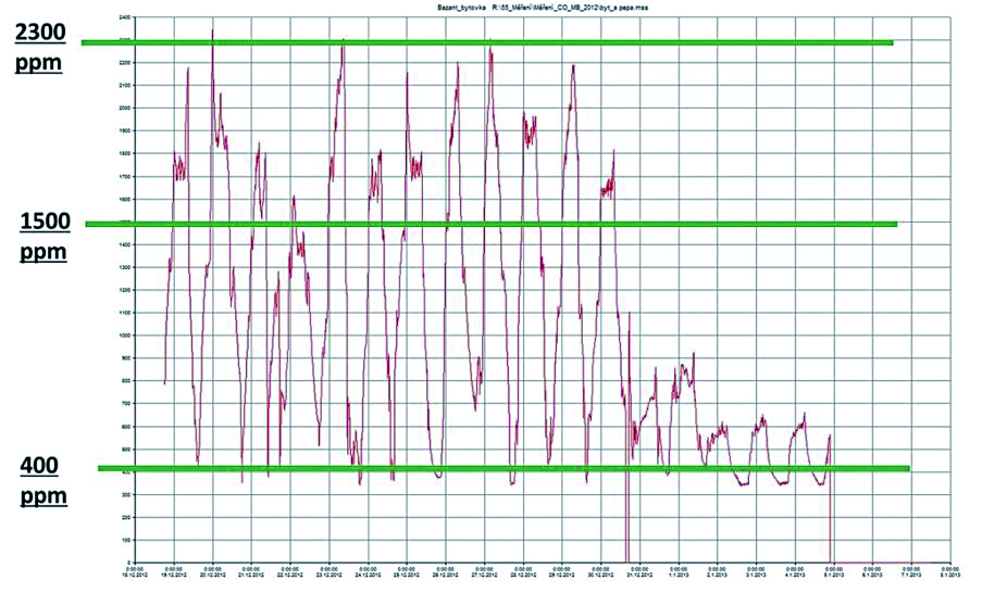 Obr. 3 Priebeh merania koncentrácie CO2 v spálni počas niekoľkých dní [9]