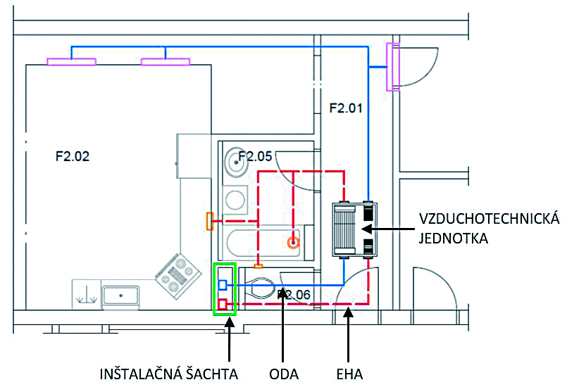 Obr. 6 Príklad decentrálnej vzduchotechnickej sústavy s centrálnym (spoločným) prívodom a odvodom vonkajšieho vzduchu ODA – prívod vonkajšieho (čerstvého) vzduchu, EHA – odvod odpadového (znehodnoteného) vzduchu